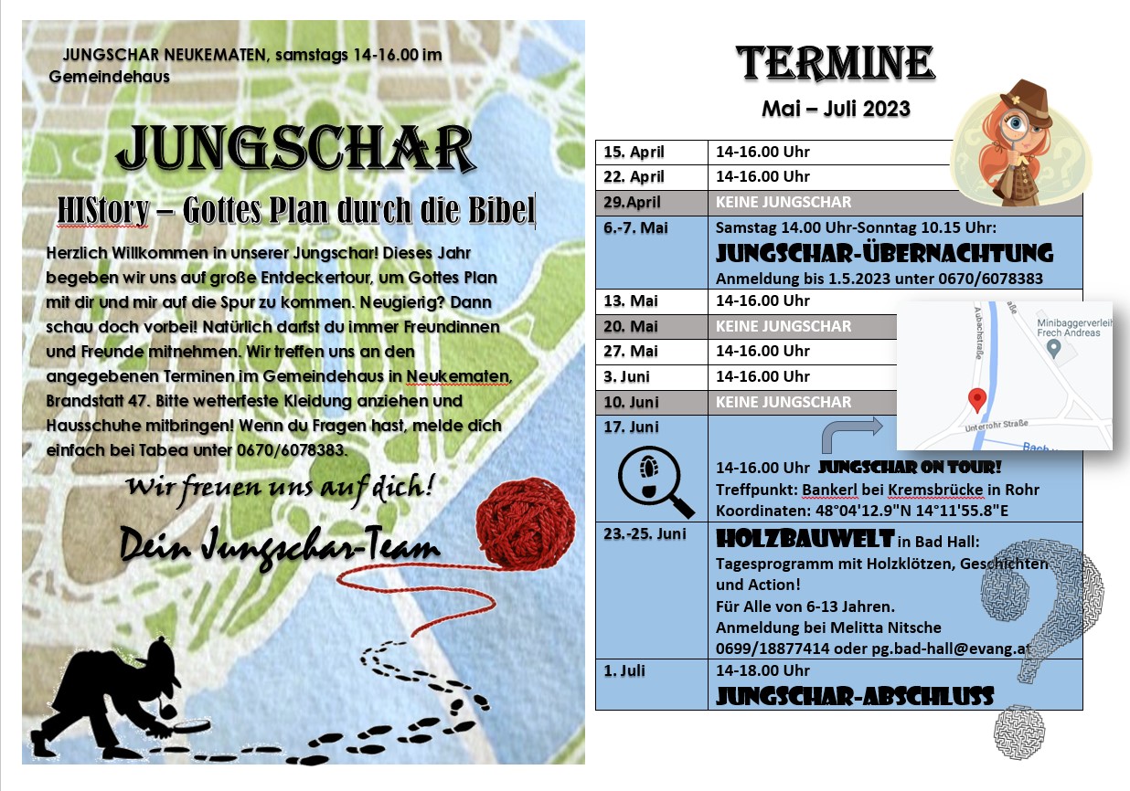 Herzliche Einladung zur Jungschar jeden Samstag unter der Schulzeit von 14:00 bis 16:00 im Jugendraum im Gemeindehaus für alle Kinder von 6-12 Jahren.